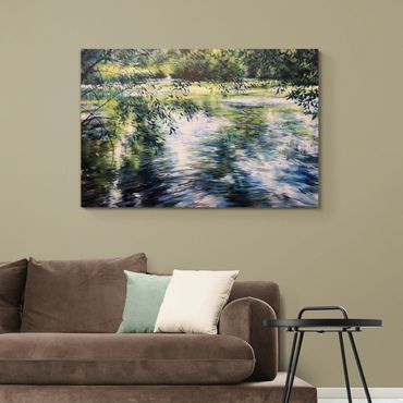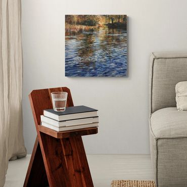 In my paintings, I explore the abstract qualities in the landscape: fleeting patterns in the river flow, multi-layering and reflectivity. Also the textures, contrasts and depths in the forest, and the movement, rhythms and colours of field grass and plant life. I aim to convey a sense of quietness and ‘solitary involvement’ with this landscape.”